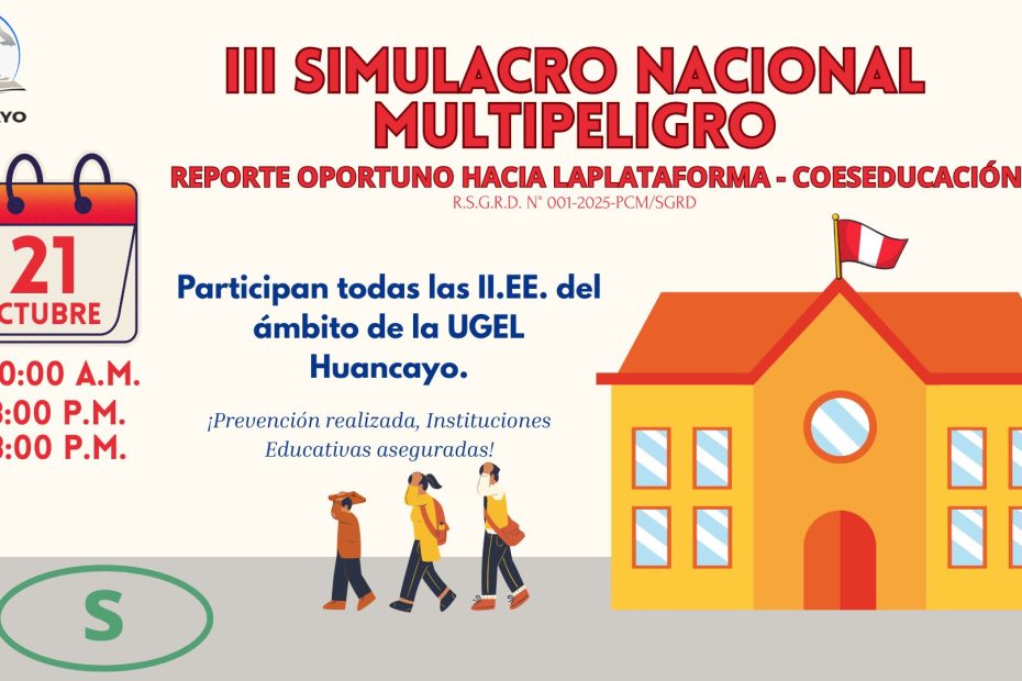 📢✨ ¡Atención comunidad educativa de Huancayo! ✨📢 Este 21 de octubre, todos tenemos una cita muy importante: el III Simulacro Nacional Multipeligro. 🙌🏫 Recordemos que… Leer más »III SIMULACRO MULTIPELIGRO